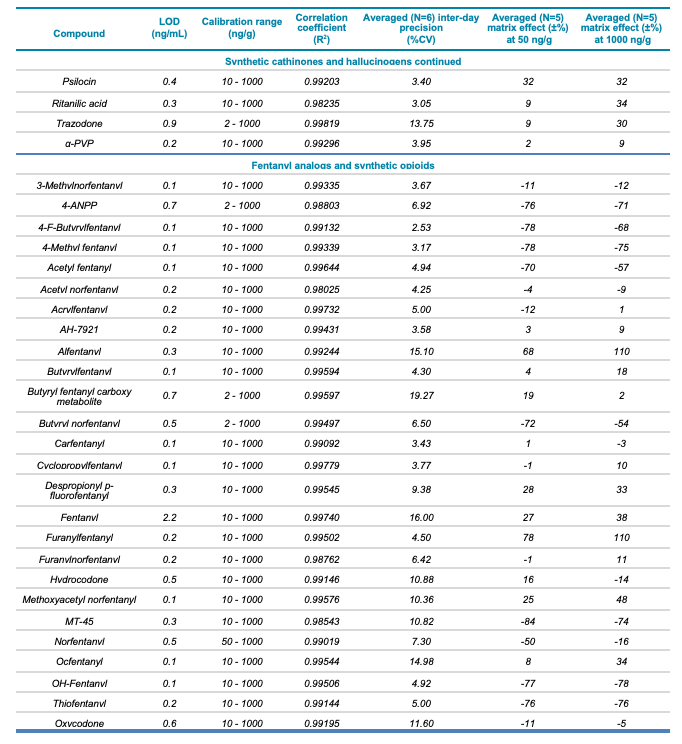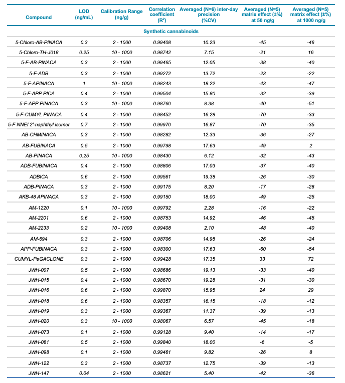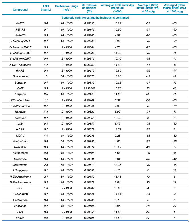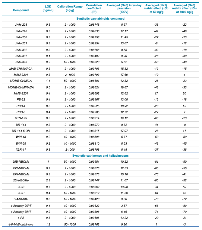 Meconium is a complex biological matrix due to its heterogegenous composition, which often causes ion suppression or detection interference of target analytes when using LC-MS. The efficiency of the sample preparation procedure to selectively remove the matrix interferences was determined by calculating the matrix effect (ME). ME is defined as the ion suppression/enhancement ratio and is expressed as ±%. The average ME (±%, n=3) was calculated by expressing the ratio of the average peak area of each analyte in neat solvent vs. post-extraction spiked matrix as a percentage, at low (50 ng/g) and high (1000 ng/g) concentration levels. The ME ranged from -70 to 72% for synthetic cannabinoids, -89 to 71% for synthetic cathinones and hallucinogens and -88 to 110% for fentanyl-analogous and synthetic opioids. The ME values at low and high concentrations are summarized in Table 1.