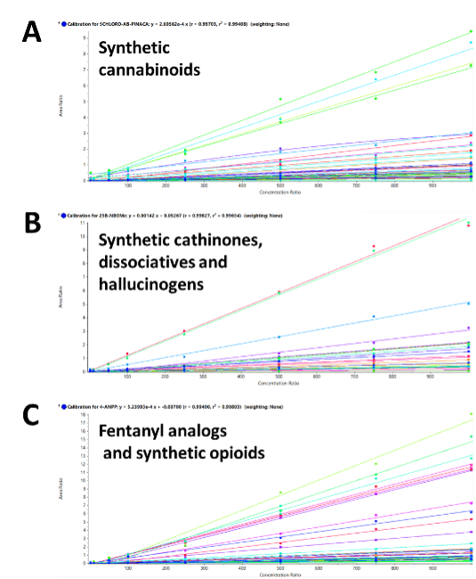 Calibration curves were generated for each of the 137 molecules. Figure 4 shows representative regression lines from each of the 3 NPS classes, plotted from 2 to 1000 ng/g. The calibration curves showed excellent linear responses across the calibration series, with R2 values greater than 0.98 for all the NPS targeted in the panel. These parameters demonstrate the broad applicability of the sample preparation procedure to a variety of NPS classes.