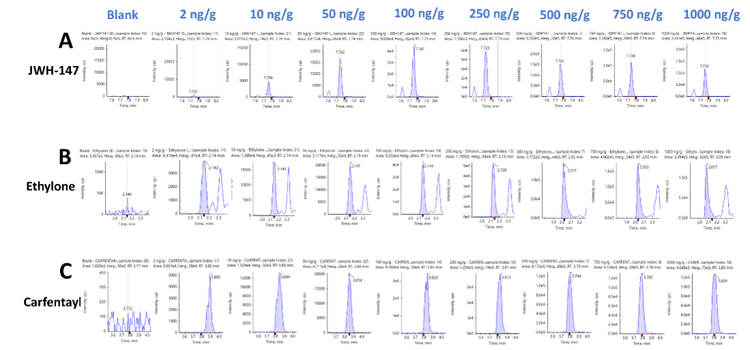Figure 3 shows representative XICs for 3 drugs representative of each of the 3 NPS classes included in this panel. XICs are shown for A) JWH-147, a synthetic cannabinoid, B) ethylone, a stimulant and C) carfentayl, a fentanyl analog. The XIC traces display the signal for a blank injection (left) and for 8 concentrations ranging from 2 to 1000 ng/g. The lower limit of detection (LLOD) for the 137 NPS molecules targeted in this study ranged from 0.04 to 2.4 ng/g.