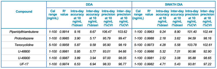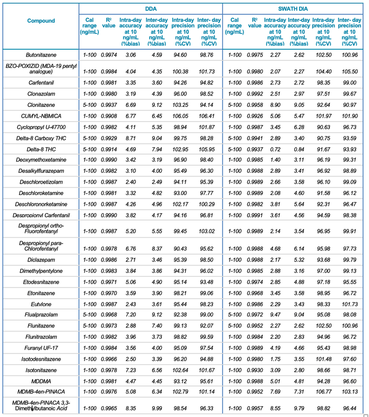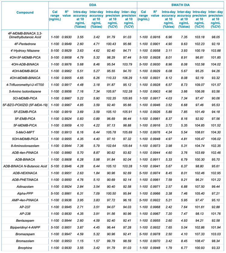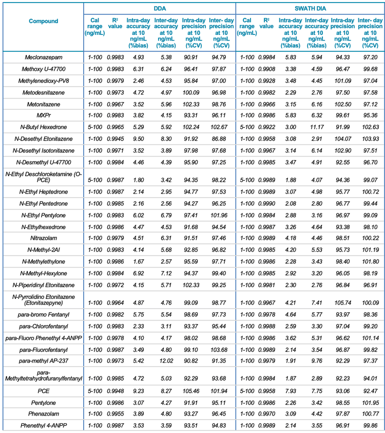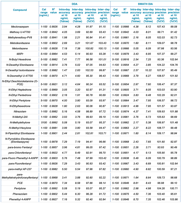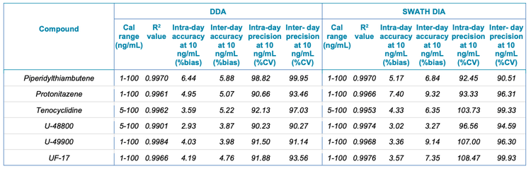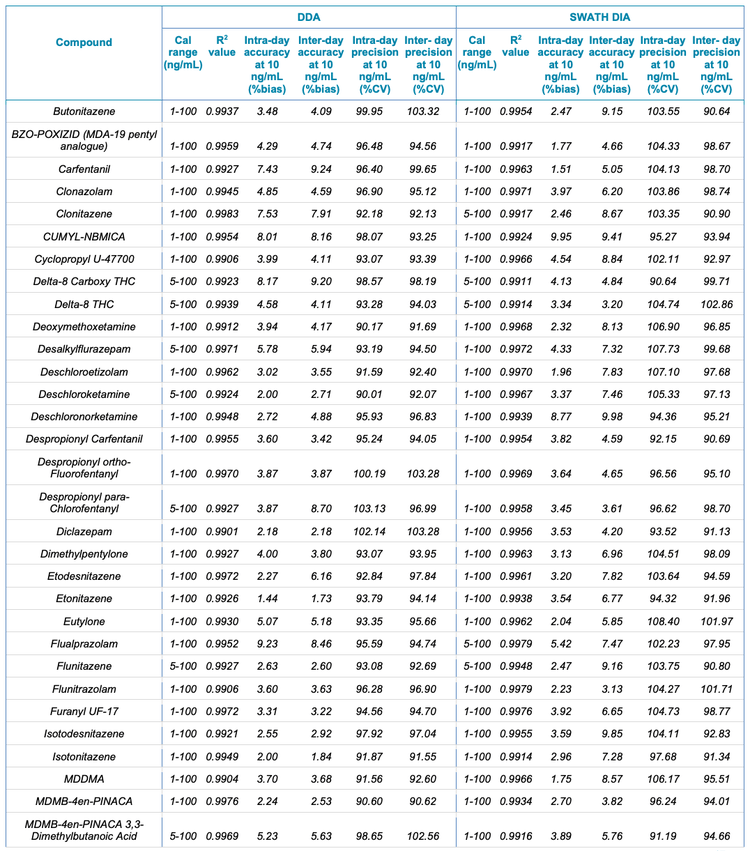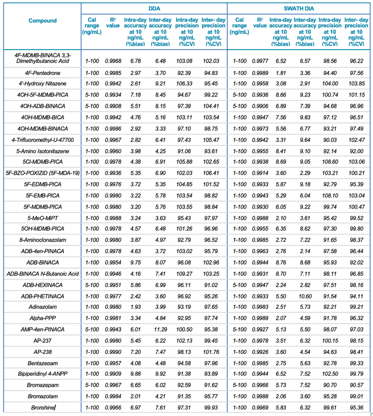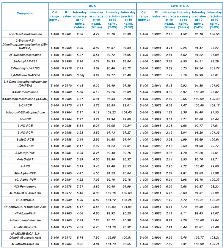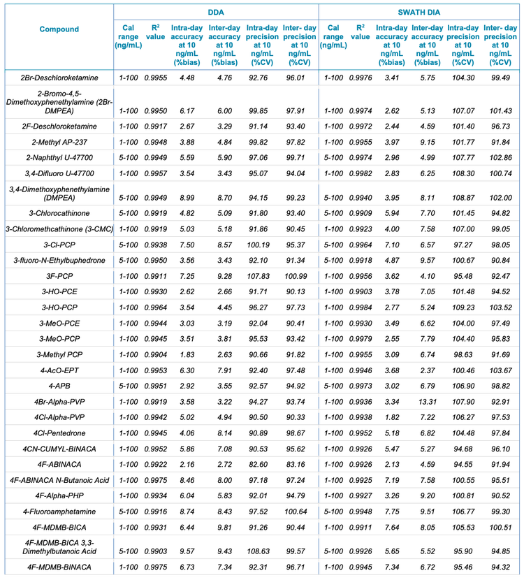 Table 2. Statistical results for the 130 NPS extracted from human whole blood samples using DDA and SWATH DIA. The table includes the name of the compound, calibration range (ng/mL), linear correlation (R2 value) and the inter- and intra-day accuracy (%bias) and precision (%CV) for each of the 2 acquisition methods investigated.