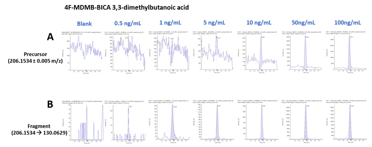 Figure 8. SWATH DIA enables flexible and reliable quantification using precursor (top) and fragment (bottom) ion information. Quantification of 4F-MDMB-BICA 3,3-dimethylbutanoic acid at concentrations ranging from 0.5 to 100 ng/mL using A) precursor ion information (206.1534 ±0.01 m/z) and B) fragment ion information (206.1534 --> 130.0629 ±0.01 m/z). The use of the fragment ion significantly reduced the background signal.