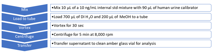Human urine samples: 10 µL of the 10 ng/mL internal standard mixture was added to 90 µL of each of the human urine calibrator solutions. Then 700 µL of water and 200 µL of methanol were added and the resulting solution was vortexed for 30 seconds and centrifuged for 5 minutes at 8000 rpm. The supernatant was transferred to a clean amber glass vial for analysis. The dilute-and-shoot preparation procedure for human urine is summarized in Figure 3.