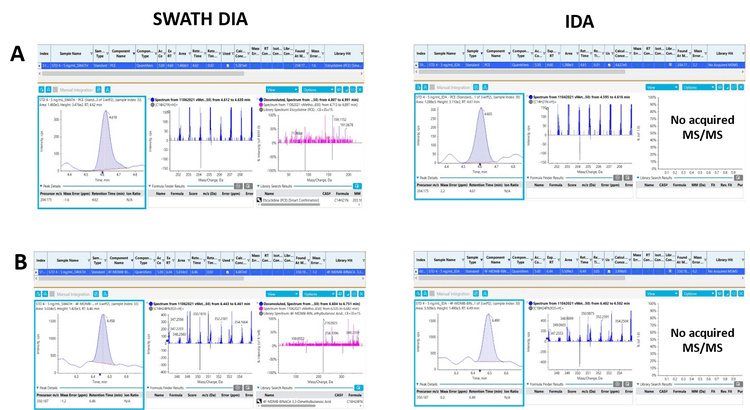 Figure 10. Comparison between SWATH DIA and DDA for TOF MS/MS spectral acquisition. XICs, TOF MS and TOF MS/MS spectra acquired using SWATH DIA (left) and DDA (right) for A) PCE and B) 4F-MDMB-BINACA 3,3-dimethylbutanoic acid. The comparisons demonstrate that no TOF MS/MS spectra were acquired when using DDA at the same concentration levels due to the acquisition method prioritizing the most abundant ions in each data cycle to trigger the TOF MS/MS experiments and missing the low-abundant species present in the biological samples. SWATH DIA, however, generated TOF MS/MS spectra with high (>90%) MS/MS library scores at the same concentration levels.