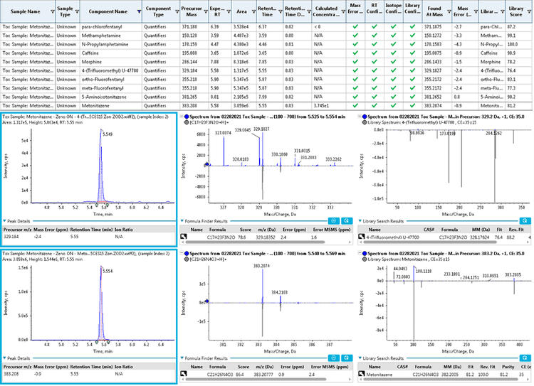 Figure 6. Streamlined and confident NPS identification using SCIEX OS software. (Top) Results table in SCIEX OS software showing the analytes positively identified in an authentic case sample. Mass, library match and library score were assessed using the confidence criteria. (Bottom) XICs, TOF MS and TOF MS/MS spectra collected provided detailed and confident identification of 2 of the positively identified analytes, 4-(trifluoromethyl) U-47700 and metonitazene, 2 synthetic opioids included in the NPS panel.