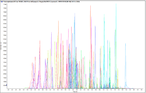 Figure 1. Chromatographic profile of the 130 NPS targeted in this study using the LC conditions of the SCIEX vMethod™ application for forensic toxicology screening on the X500R QTOF system. Extracted ion chromatogram (XIC) resulting from the near baseline separation of the 130 NPS in a 9.5-minute gradient.