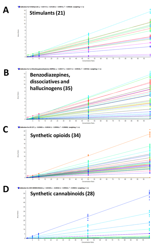 Figure 9. Excellent linearity for the 130 NPS included in the panel.  Calibration curves resulting from the calibration series for A) 22 stimulants; B) 35 benzodiazepines, dissociatives and hallucinogens; C) 34 synthetic opioids and D) 28 synthetic cannabinoids. Excellent linear response and sensitivity were observed with R2 values greater than 0.99 for all the molecules included in this panel.