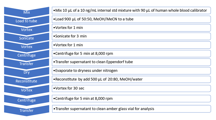 Human whole blood samples: 10 µL of the 10 ng/mL internal standard mixture was added to 90 µL of each of the human whole blood calibrator solutions. Then 900 µL of a 50:50, methanol/acetonitrile solution was added to deproteinize the human whole blood samples. The resulting solution was vortexed for 1 minute and then sonicated for 3 minutes. The solution was then vortexed for 1 minute and centrifuged for 5 minutes at 8000 rpm. The supernatant was transferred to a clean Eppendorf tube and completely dried down under nitrogen gas. The residues were reconstituted with 500 µL of 20:80, methanol/water. The reconstituted solution was mixed for 30 seconds then centrifuged for 5 minutes at 8000 rpm. The supernatant was transferred to a clean amber glass vial for analysis. The protein precipitation procedure for human whole blood samples is summarized in Figure 2.