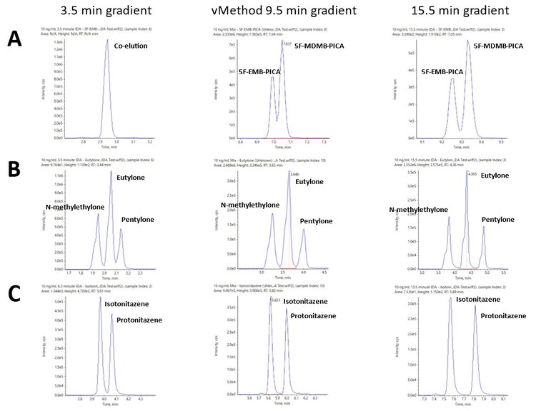 Figure 5 shows the extraction ion chromatogram (XIC) traces for 3 groups of isobaric species separated using LC runtimes with 3.5-, 9.5- (vMethod conditions) or 15.5-minute gradients. Figure 4A shows that the 9.5-minute vMethod condition was unable to achieve baseline separation of 5-MDMB-PICA and 5F-EMB-PICA, 2 isobaric synthetic cannabinoids. The use of the longer, 15.5-minute gradient enabled baseline separation of these 2 isobaric species. The use of a shorter, 3.5-minute gradient resulted in co-elution of these 2 species, demonstrating that distinguishing these 2 isobaric synthetic cannabinoids is not possible by only LC separation with such a short gradient. Figure 4B shows that baseline separation of 3 synthetic cathinone isobaric species, eutylone, N-methylone and pentylone, was achieved using the generic, 9.5-minute vMethod conditions.