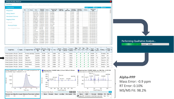 The use of high-resolution mass spectrometry enables collection of untargeted, accurate mass TOF MS scans of precursor ions followed by acquisition of comprehensive, high-quality TOF MS/MS spectra of the precursor ion fragments.  As a result, the non-targeted nature of the DDA and SWATH DIA data acquisition methods used in this workflow allows for expanded drug detection capabilities. Identification of these new drugs in previously acquired datasets can be performed retrospectively using the updated list of NPS provided in this technical note, which includes the name, molecular formula and retention time of each compound. This allows datasets to be re-processed when newly identified forensic targets are discovered without the need to re-inject samples. Figure 7 shows the results of the retrospective analysis of a postmortem case sample that was initially analyzed in 2019. The results table generated in SCIEX OS software shows the positive identification of 7 compounds. Retrospective data analysis was performed on the same data using the updated list of NPS presented in this workflow. Figure 7 shows the detection of the same 6 compounds that were originally identified in 2019 with the addition of Alpha-PPP, one of the stimulants included in this panel. The same confidence criteria were used for confident identification of Alpha-PPP in the re-interrogated sample. Figure 7 (bottom) shows the XICs and TOF MS and MS/MS spectra of Alpha-PPP. A precursor mass error of -0.9 ppm, retention time error of 0.10% and MS/MS fit score of 98.2% provided excellent measures for the confident identification of this analyte in the postmortem case sample.