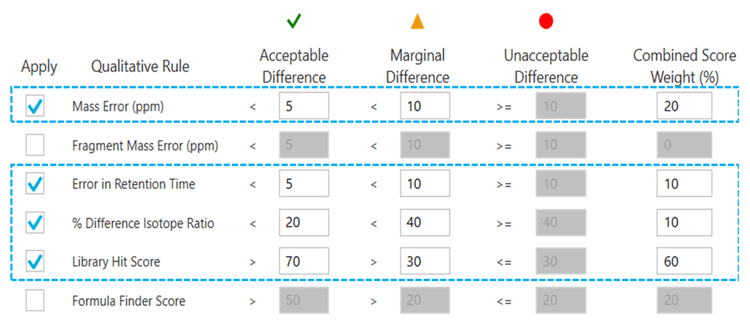 Figure 4. Confidence criteria used for data processing in SCIEX OS software. Qualitative rules including mass error (20%), retention time (10%), isotope ratio difference (10%) and library score (60%) used to assess positive analyte identification using the traffic light system.