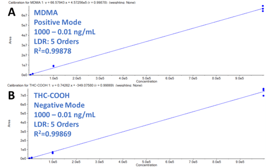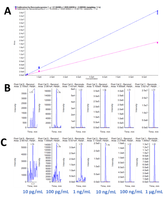 Achieving high sensitivity and linearity of calibration is essential to any toxicology laboratory needing to screen and quantitate large panels of target analytes on a daily basis. Figure 3 shows the extracted ion chromatogram (XIC) traces for the two transitions (290.1 Da à 168 Da, Figure 3B, and 290.1 Da à 105 Da, Figure 3C) of benzoylecgonine and the two resulting calibration curves (Figure 3A). The two series of XIC traces show a high level of consistency and precision across the calibration series for concentrations ranging from over 5 orders of magnitude. In addition, excellent linearity was observed for both transitions of benzoylecgonine with R2 values of 0.9996 and 0.9975, respectively.