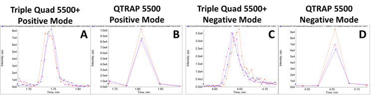 Mass spectrometry: Both the SCIEX QTRAP 5500 System and SCIEX Triple Quad 5500+ System – QTRAP Ready were run using the same method parameters and the same Turbo V™ Source, with generic settings appropriate for the flow rate. The same LC stack was used and moved between the instruments in an attempt to reduce variability and to allow direct comparison of the MS instruments performance. An acquisition method consisting of 196 MRM transitions was created using the Scheduled MRM™ Algorithm in Analyst® Software 1.7.1 to ensure the highest data quality was acquired. The MRM transitions monitored and the source parameters were based on the previously-published technical note.1 Each standard mixture was injected in triplicate. Data was processed in MultiQuant™ Software 3.0.3.