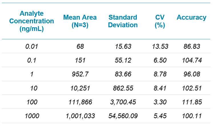 Using an analytical method that consistently delivers reproducible and accurate results for every injection of every batch is essential to attaining reliable results. In this experiment, a series of three replicate injections were run to evaluate the reproducibility and robustness of the method using the SCIEX Triple Quad 5500+ System. The Percent Coefficient of Variance (%CV) and the Accuracy were calculated for each concentration used in the calibration range. The statistical results for the wide dynamic range calibration curve for benzoylecgonine on the SCIEX Triple Quad 5500+ System are summarized in Table 1. Excellent reproducibility and accuracy were observed across the tested concentration range (5 orders of magnitude) using generic settings and without extensive assay optimization. Similar trends were observed for the majority of the target analytes in this study.