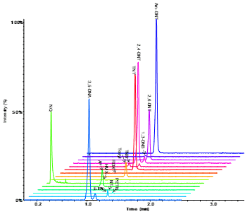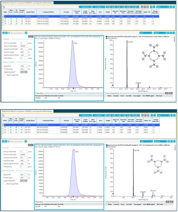 Table 1 lists the observed spectral precursor mass and corresponding proposed molecular species, associated mass error (ppm). Most explosives were observed as deprotonated molecular form [M-H]-. A number of adducts and alternative molecular species were also observed. Figure 4 shows XIC chromatograms and TOF MS spectra of the acetate adducts for nitramine explosives (HMX and RDX).