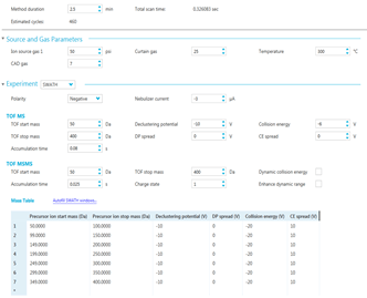 SWATH acquisition workflow consisted of a TOF MS scan with looped MS/MS experiments. The Q1 windows (50 Da each) covering 50-400 m/z were automatically populated by SCIEX OS software 1.3 for a total cycle time of 0.32 sec. Figure 3. displays the data acquisition methods and source conditions.