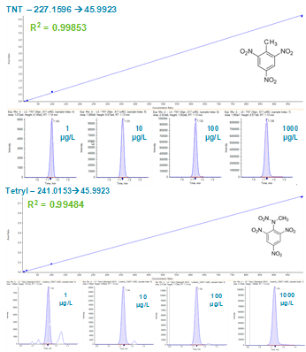 Figure 4 shows calibration curves and XICs obtained for TNT and Tetryl using 13C-TNT as the internal standard for quantitation. Linear dynamic range of the explosives analyzed was evaluated and most analytes showed linearity between 1-1000 µg/L.