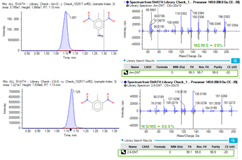 SWATH acquisition generates comprehensive and high quality MS/MS spectra for quantitation and identification using spectral library database searching. Figure 5 shows extracted ion chromatograms for Am-DNT and 2,6-DNT. The MS/MS spectra allowed the positive identification of both explosives through spectral library searching.