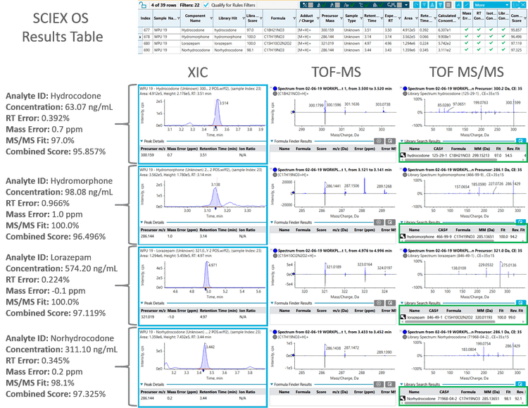 Figure 4 shows the successful detection of hydrocodone, hydromoprhone, lorazepam and norhydrocodone from one of the tested workplace testing case samples at concentration of 63.07, 99.08, 574.20 and 311.10 ng/mL, respectively. The displayed results table in the SCIEX OS Software includes detailed information about the positively identified analytes filtered using the “traffic lights” based on the confidence criteria. SCIEX OS Software also provides the ability to review the XIC, TOF MS and TOF MS/MS spectra for each of the positively identified analytes. The library matching scores (>97%) together with the excellent calculated combined scores (>95%) for the four detected analytes provides a confident metric for the accurate identification of the drugs in this urine case sample. Table 3 summarizes the results of the workplace testing urine sample detailed in Figure 4 and includes the list of positively identified drugs along with their concentration, library score and combined score.