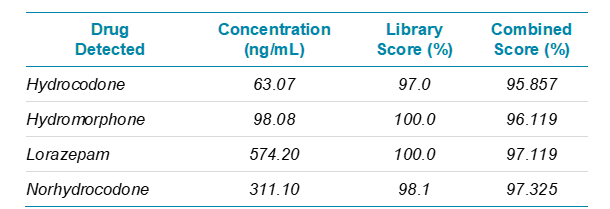 The robustness of the combined acquisition workflow was further investigated by analyzing ten workplace testing urine samples. These biological specimens were prepared using the aforementioned dilute-and-shoot sample preparation method and analyzed using the X500R QTOF System to generate comprehensive and high-quality spectra. The high-resolution data enabled accurate detection of the drugs present in the case samples through extraction of specific accurate mass fragment ions that were matched to a spectral library database for confident identification.