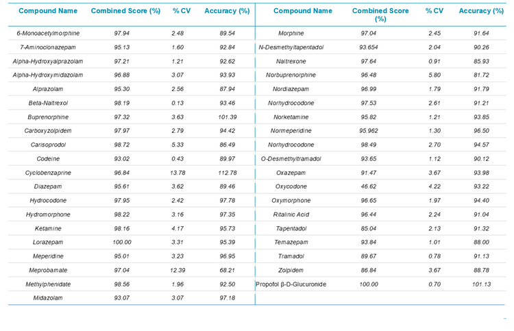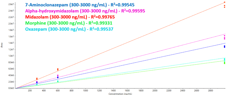 Developing a robust workflow that produces accurate and reproducible results is critical for its full implementation into routine laboratory testing. In this experiment, three replicate injections of the spiked urine samples at three concentration levels were performed to evaluate the linearity and the quantitation performance of workflow. These three-point calibration curves covered clinically-relevant concentrations ranging from LOD to 10x LOD for each of the drugs used in this panel. Three replicates for each concentration were used to build the calibration curves.