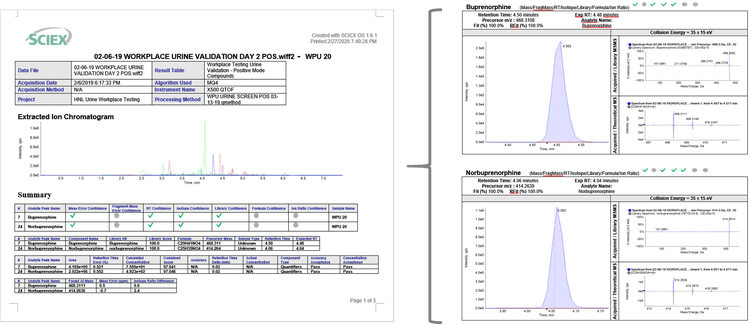 Figure 5 shows a customized report generated by SCIEX OS Software following the processing of a workplace testing urine sample. The report includes the total ion chromatogram (TIC) of the detected drugs along with a results table including the concentration, the library search score and combined score for each of the positively identified drugs present in the urine sample based on the acceptance criteria. Detailed XIC, TOF MS and TOF MS/MS spectra are also included to support the positive identification of buprenorphine and norbuprenorphine in the reported urine case sample at concentration of 41.65 and 492.30 ng/mL, respectively. A variety of report templates are available in SCIEX OS Software to accomodate different types of reporting needs. Those sample reports can also be modified to include custom reporting fields such as analyte retention time, retention time error, precursor mass, found at mass, mass error and concentration acceptance, among many others.
