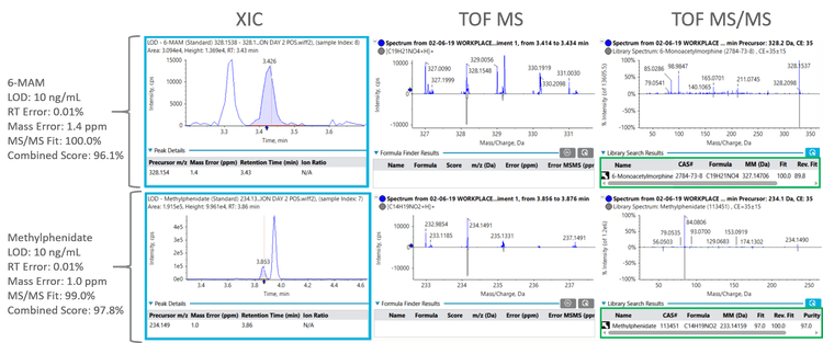 Two different data acquisition strategies were used to streamline the detection of the different classes of compounds making up the panel of the 39 drugs. This was performed to ensure collection of high quality data and to achieve desirable limits of detection (LOD) for all 39 compounds. Information Dependent Acquisition (IDA) was used as the acquisition strategy to detect compounds that ionize in positive ion mode. This acquisition method enables collection of high-quality TOF MS and TOF MS/MS spectra of the most abundant precursor/candidate ions. The resulting MS/MS spectra was used for confident drug identification using spectra library matching. MRMHR workflow was used as the acquisition strategy to detect the compounds that ionize in negative ion mode. This data acquisition method is often used to increase detection specificity and sensitivity, and again confident compound identification is achieved by MS/MS spectral library matching.