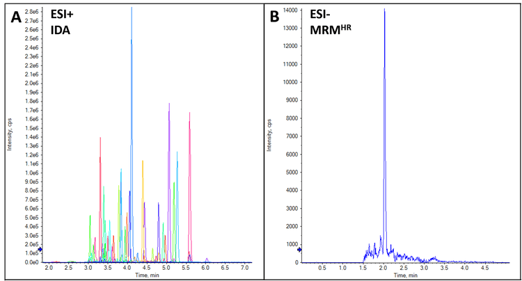 Mass spectrometry: MS and MS/MS data were collected for each sample using the SCIEX X500R QTOF System. Information Dependent Acquisition (IDA) was used in positive ion mode. MRMHR workflow with the Apply TOF start/stop mass feature activated was used in negative ion mode. Both detection methodologies contain a TOF MS experiment.