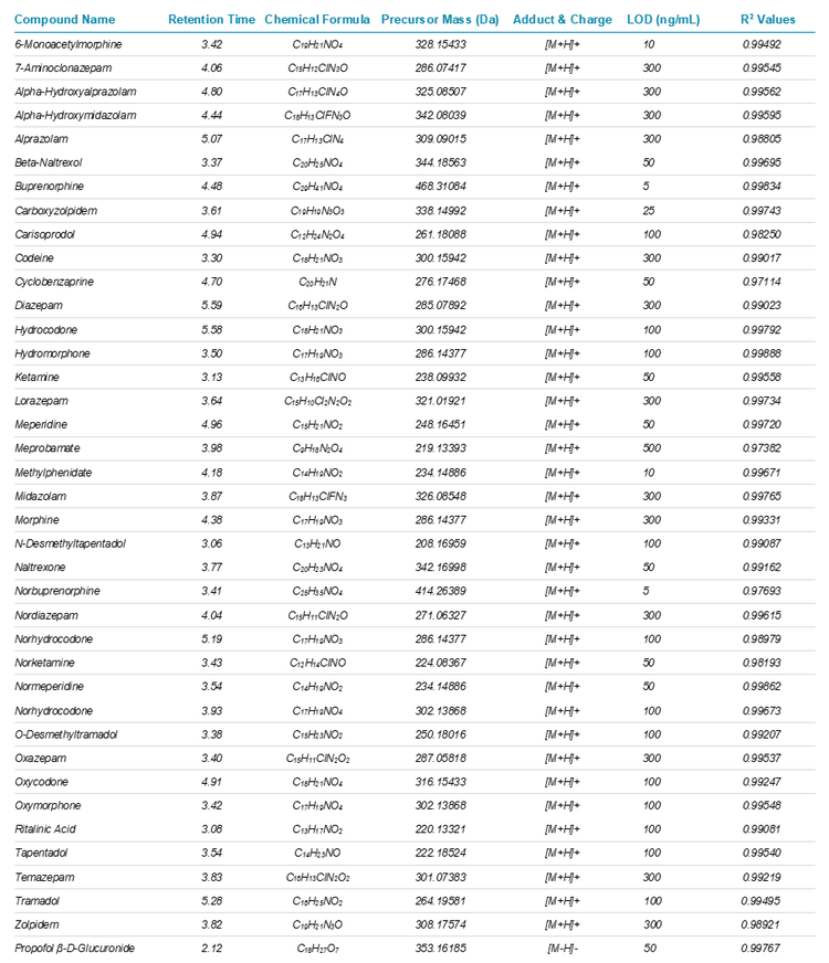 Sample preparation: A standard mixture containing the 39 drugs used in this workplace testing panel was prepared by diluting with methanol: water (20:80, v/v). Three calibrator solutions ranging from 5 to 5000 ng/mL were prepared. The highest calibrator solution was used for initial method development and to determine the retention time of the 39 targeted drugs. Table 1 lists the name of the drugs used in this panel and includes their accurate mass information, chemical formula, retention time, limits of detection (LOD), and R2 values.