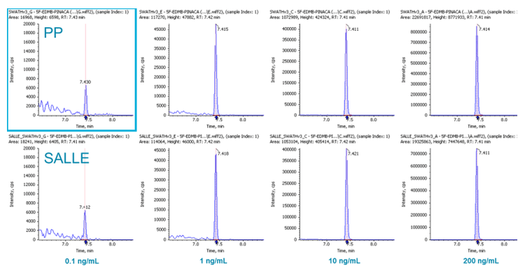 For blood samples, one of the most widely used sample preparation procedures is (PP) (followed by drying down and reconstitution). In this study, we not only tested PP but also a more novel procedure called SALLE. It has been observed that adding inorganic salt into a mixture of water and a water-miscible organic solvent causes phase separation. Using high salt concentrations in water and mixing with high polarity water-miscible organic solvents, extraction of many analytes can be achieved (into the otherwise inseparable organic layer), similar to traditional LLE. In this study, it was found that these two approaches performed very similarly for our application in terms of LOD, LDR, recovery etc. Figure 6 displays the signal comparison between PP and SALLE of 5F-EDMB-PINACA in whole blood at a few spiked concentrations, demonstrating the similarity in signal response between the two approaches.