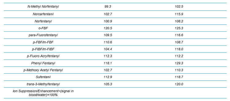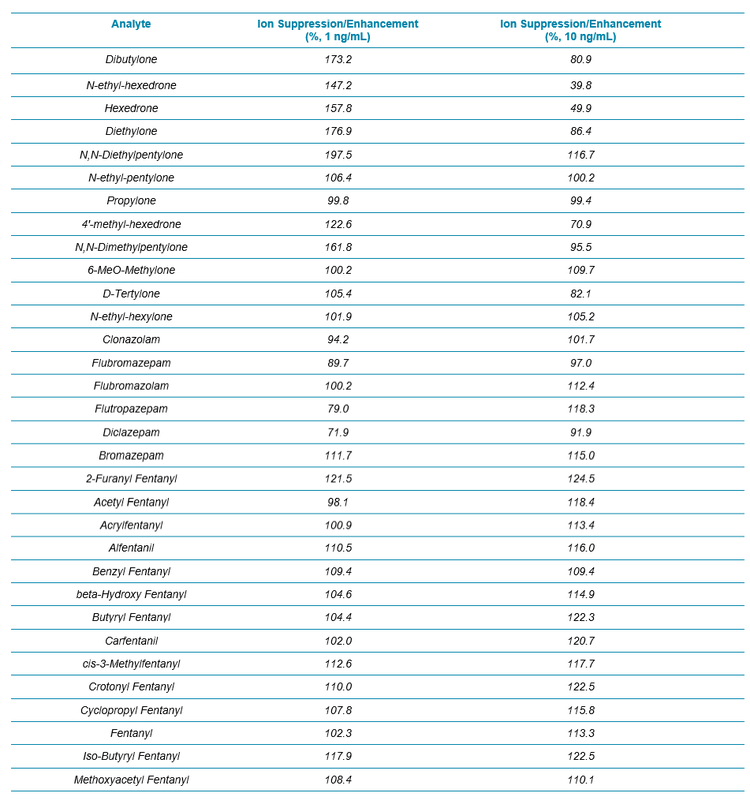Two water samples were prepared by spiking analytes at 1 and 10 ng/mL, and the signals of all the analytes/internal standards were compared between the spiked water and blood samples. The results for all the analytes in the NPS panel are summarized in Table 3. Overall, except some enhancement observed for a few synthetic cathinones at 1 ng/mL, no significant ion suppression or enhancement was seen for any of the benzos and fentanyl analogs.