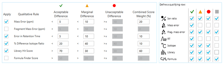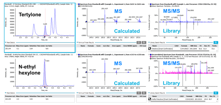 For data processing, the user could rely on both precursor ion information (mass accuracy, RT, isotope distribution pattern difference) as well as fragment ion information (MS/MS spectra matching to database) in the acquired data. In addition, SCIEX OS software automatically computed scores for these parameters and combined these scores to generate an aggregate score (“Combined Score”) with customized weightings (Figure 2, left). Positive findings were determined with a combination of these performances as well as a minimum “Combined Score” of 30%.