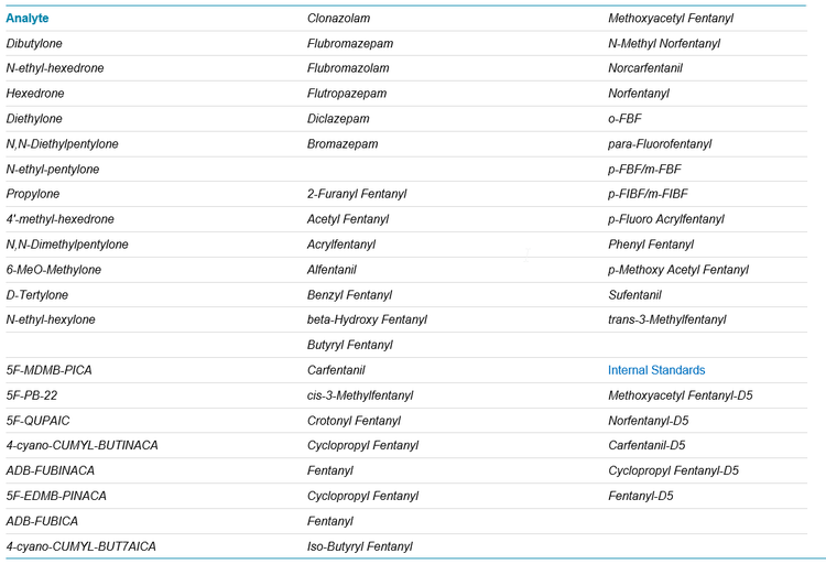 - Here, a NPS panel was tested consisting of 54 analytes, which include synthetic cannabinoids, cathinones, benzodiazepines and fentanyl analogs (Table 1)