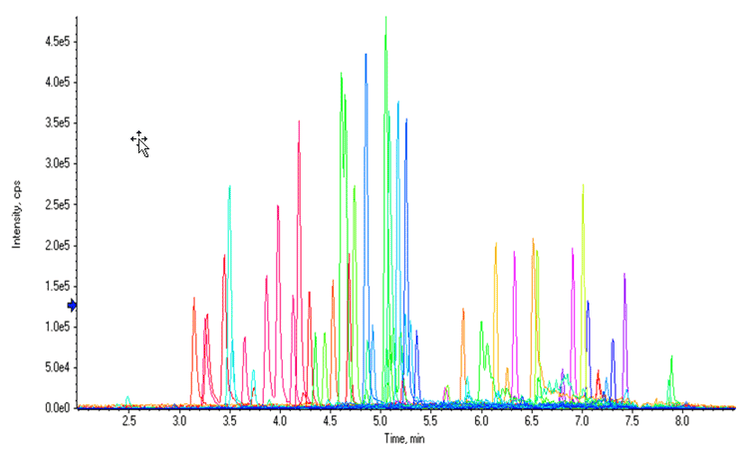 Regarding data acquisition, a variable window SWATH Acquisition method was used in the study. This method included a survey scan experiment (TOF-MS) followed by 12 different Q1 isolation windows for the MS/MS covering mass range from 100 to 500 m/z, where most of the analyte masses are found.