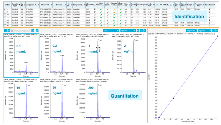 An example of simultaneous identification and quantitation of 5F-QUPAIC, a new synthetic cannabinoid, is shown in Figure 4. The identification parameters and performances are in the upper identification panel and include mass error, RT difference, isotope difference, MS/MS library matching score, etc. In the lower quantification panel, the XICs (based on accurate mass data) using 0.01 m/z mass extraction window are shown together with the linear-fitted calibration curve (0.1 to 200 ng/mL) with an R2 value of 0.99958.