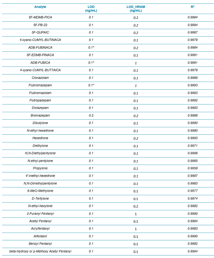 - Great linear dynamic range (LDR) was shown with R2 values >0.995 for all analytes