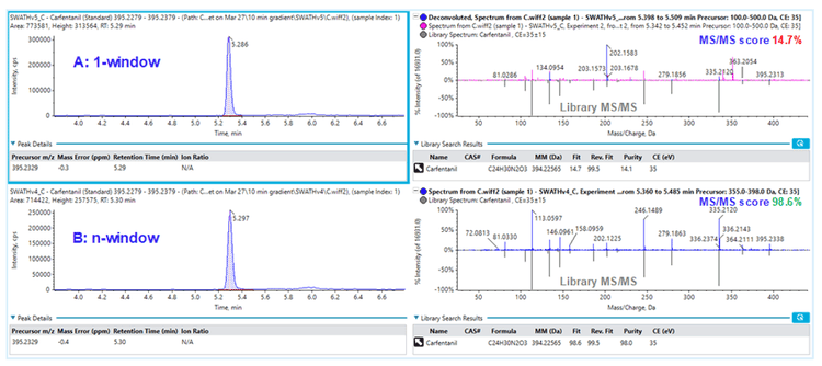 It was not surprising that the variable window SWATH Acquisition approach yielded much improved MS/MS matching scores between the unknown and MS/MS database for more accurate identification as shown in Figure 9 for the detection of carfentanil. The top row showed the XIC of carfentanil precursor ion (left) and the MS/MS matching with 1-window SWATH Acquisition method (right). One of the main fragments observed from 1-window method was at 202.1583 m/z and it was unclear what the precursor ion was, but this intense fragment ion dwarfed the actual fragment ions from carfentanil, causing the MS/MS matching to fail (matching score 14.7%), and would possibly render a false-negative finding. With the variable window approach shown in the bottom row, the MS/MS information for carfentanil was acquired in the Q1 window of 355-398 m/z and the MS/MS matching score was improved to 98.6%, which allowed correct identification of carfentanil. As the main 202.1583 m/z fragment ion seen in the 1-window approach is significantly reduced, it probably came from a precursor ion outside of 355-398 m/z window.