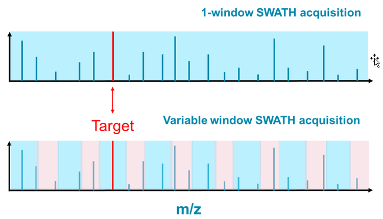 Using the second approach, termed variable window SWATH Acquisition, the target mass range was divided into multiple windows varying in size, and the MS/MS information would be acquired for each in a sequential fashion. The resulted MS/MS information was not only comprehensive but significantly more specific compared to the 1-window approach. For the Target ion in Figure 8, one could safely expect that the MS/MS information from the variable window approach would be easier to interpret than the 1-window approach.