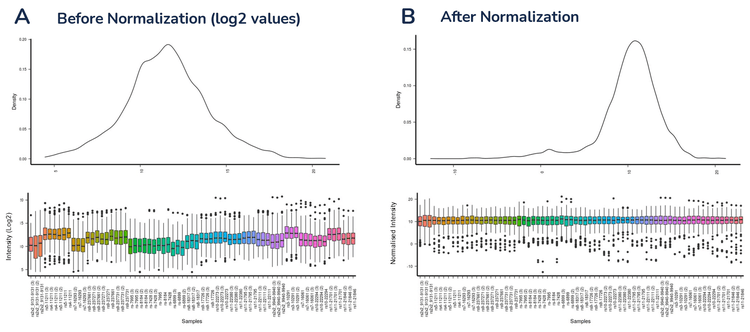 Data were collected using SWATH acquisition on the cohort of 75 forensic urine samples. These raw, unprocessed data were uploaded to the Polly El-MAVEN application for data processing. A targeted feature detection (for example, peak picking and integration) was performed using an exhaustive spectral library with more than 11,000 spectra. From this analysis, 152 features were detected, 110 of which were unique. Further analysis was then performed using the Polly Dual-Mode Data Visualization (Metabolomics) App. The raw peak areas of the detected features were normalized for downstream statistical analysis. Figure 2 shows the density plots and boxplots A) before and B) after data normalization. The density plots and boxplots show a normal distribution of the data across the samples following data normalization.