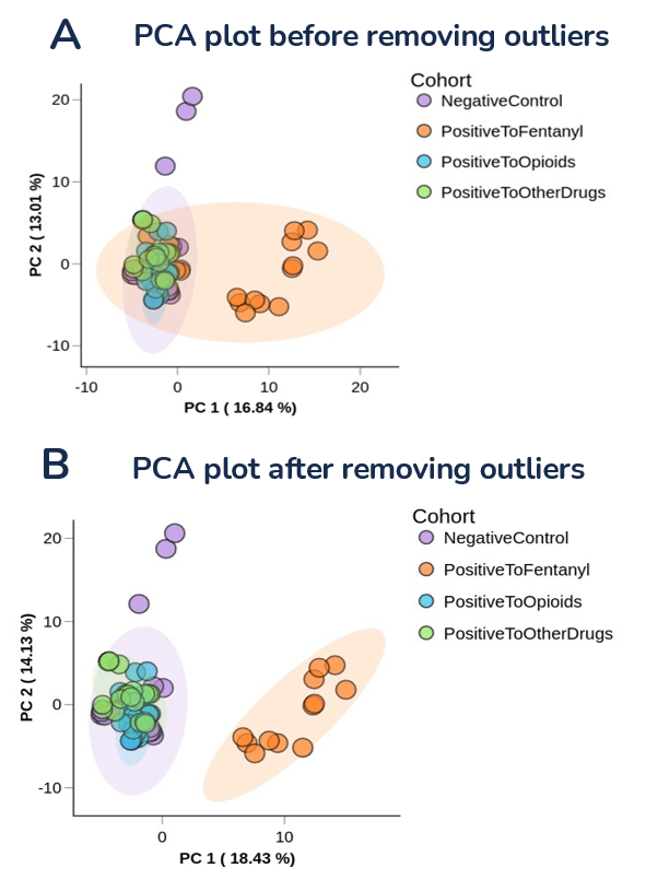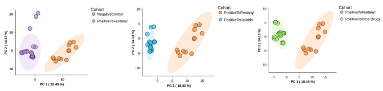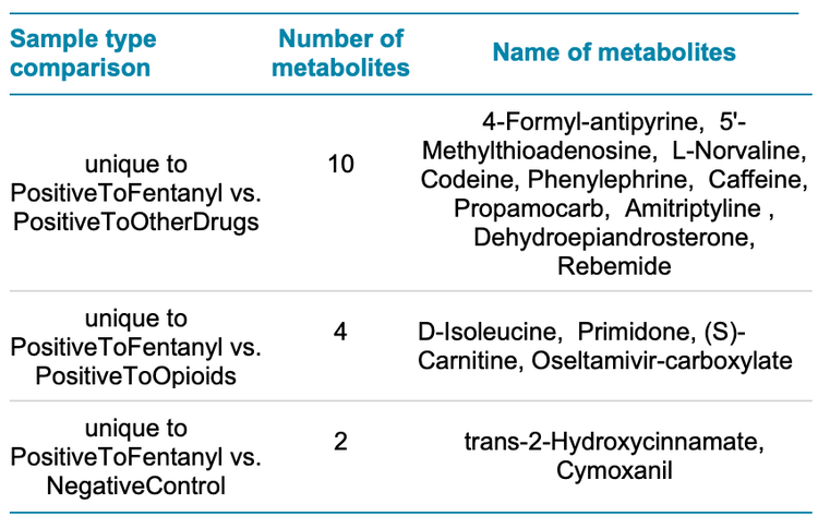 Differential expression analysis was performed to compare the abundance level of detected metabolites between the PositiveToFentanyl samples and the other samples. Statistics were applied to assess the significance of any differences detected. These analyses were implemented to identify unique metabolomic signatures that could differentiate the sample groups and correlate with the type of drug consumed.