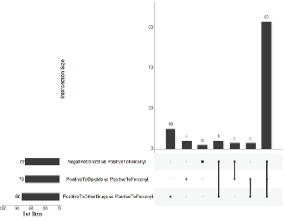 The statistical tools available in the Elucidata’s Polly platform enabled interactive visualization of the dataset, showcasing metabolic differences between the sample groups. To further complement the comparison of different samples, a cross-sample comparison was performed using the information extracted from the pathway analysis. This comparison provides a deeper understanding of the metabolites that differ or are shared between the sample groups included in this dataset. Figure 7 shows an UpSet plot that helps visualize the common/overlapping features found to be different relative to PositiveToFentanyl in the other 3 samples. The single dots in the plot highlight the metabolites that are unique to specific comparisons, for example, sample group vs. PositiveToFentanyl. The lines highlight the metabolites that were found to be different in multiple other samples relative to the PositiveToFentanyl samples.