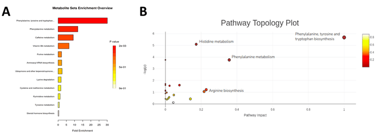 Pathway analysis is a powerful tool that helps place experimental observations into a relevant biological context. Interpreting the relative abundances of metabolites across samples at the pathway level is often crucial to draw biological conclusions. Enrichment analysis provides insight into the pathways that are most perturbed due to the biological changes under investigation. Figure 6A shows the enriched metabolic sets that are significantly different between the PositiveToFentanyl samples and the PositiveToOtherDrugs samples. The pathway topology plot shown in Figure 6B shows that the pathways involved in 1) phenylalanine, tyrosine and tryptophan biosynthesis, 2) phenylalanine metabolism and 3) histidine metabolism are the most perturbed pathways in the comparison between the PositiveToFentanyl and PositiveToOtherDrugs samples. The plots displayed in Figure 6 provide insights into the effect of fentanyl consumption compared to other drug consumption on human metabolism and offer specific information about the metabolic differences between fentanyl users and other drug users.