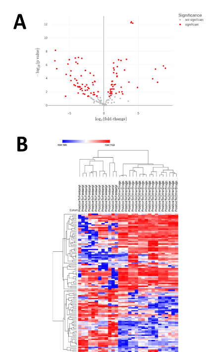 Figure 5A shows a volcano plot comparing the PositiveToFentanyl sample group to the PositiveToOtherDrugs group. The plot shows the statistical significance (p value on the y-axis) as a function of the magnitude of the differences in expression values of the samples in the groups (fold changes, expressed as log2FC on the x-axis. The plot enables visual identification of the features that are different between groups and are statistically relevant. A p value cutoff of 0.05 and log2FC threshold of 0.5 were used to identify the 102 significant features marked in red.