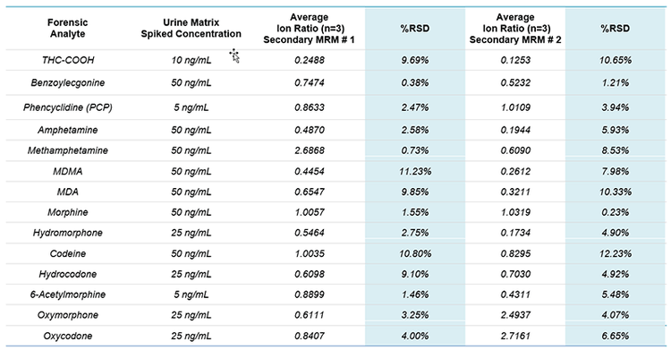 Table 2 summarizes the average ion ratios and %RSDs obtained for all the secondary MRM transitions of the USDOT forensic compounds. Table 3 details the compound identification criteria results based on retention time error and ion ratio % bias of all secondary MRM transitions. All results were automatically calculated using the SCIEX OS Software data analytics component.