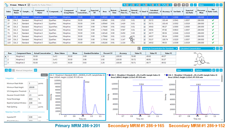 Figure 4 shows the identification of morphine spiked at 50 ng/mL in urine matrix using the SCIEX Triple Quad 4500 LC-MS/MS System. The Scheduled MRM Pro Algorithm in Analyst software 1.7 enabled the automatic triggering of secondary MRM transitions (286 -> 165 and 286 -> 152) after the detecting morphine’s primary MRM transition (286 -> 201). This feature further optimizes the MRM scheduling resulting in an increase of data quality and confidence in forensic analyte detection at low ng/mL concentration levels.