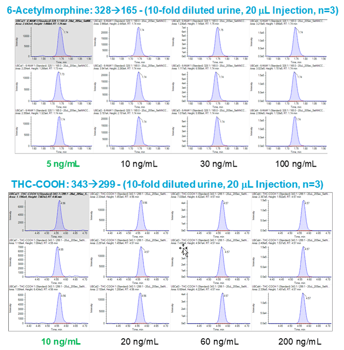 Figure 5 shows representative XICs of the quantifier MRMs of notable USDOT forensic compounds measured (THC-COOH and 6-Acetylmorphine) using an entry level LC/MS platform like the SCIEX Triple Quad 3500 LC-MS/MS system. Three replicate set of injections were performed, obtaining excellent reproducibility with RSD values less than 10% for all compounds. Complete quantitative analysis performance for multiple classes of forensic compounds has been previously demonstrated using both SCIEX Triple Quad 3500 and 4500 LC-MS/MS Systems.4,5