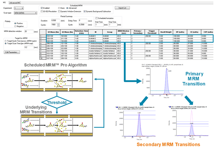 - The Scheduled MRM Pro Algorithm in Analyst software 1.7 aids in the acquisition of multiple of compounds by automatically triggering secondary MRM transitions, resulting in an increase of data quality and confidence in forensic analyte detection at low ng/mL concentration levels.