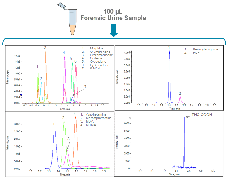 Liquid Chromatography coupled to Tandem Mass Spectrometry (LC-MS/MS) offers the speed, selectivity and sensitivity required to reliably identify different classes of illicit compounds in a forensic sample within a single workflow. In this study, a rapid method for the analysis of the updated USDOT forensic compounds in urine samples using SCIEX Triple Quad™ LC-MS/MS Systems is described.