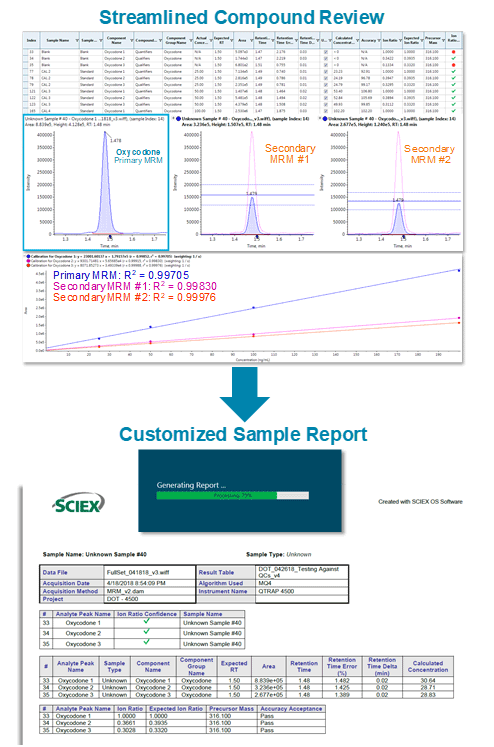 - The data analysis component of SCIEX OS Software, provided a simplified interface for streamlined data review based upon a “traffic light” display and simplified sample report generation to maximize the forensic laboratory operational efficiency.