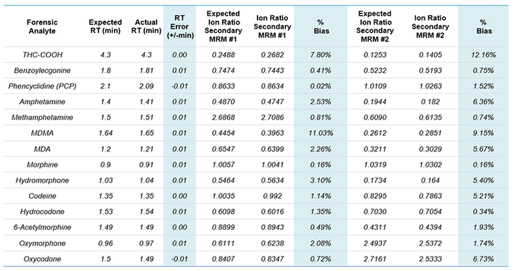 Identification of the updated USDOT forensic compounds was further evaluated using Scheduled MRM Pro algorithm meeting SWGTOX analytical criteria (analytes at the lowest concentrations that are capable of reproducibly providing symmetrical peaks and the minimum mass spectral identification ratios, while maintaining a bias of ±20% and % RSDs of <20%).3