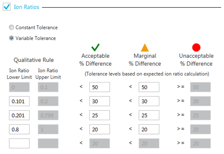 Data review and processing: Targeted data processing was performed using SCIEX OS Software data analysis component. Positive analyte identification was determined by establishing the following variable tolerance ion ratio criteria: